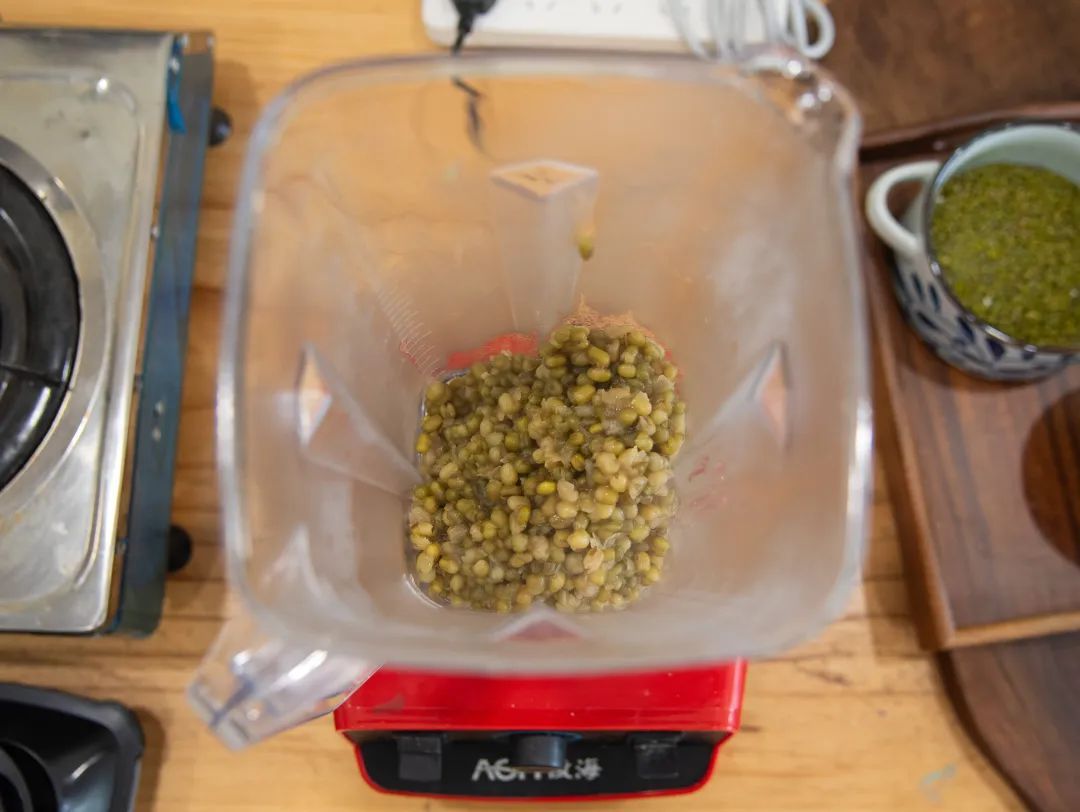 5.将煮好出沙的绿豆放入破壁机。