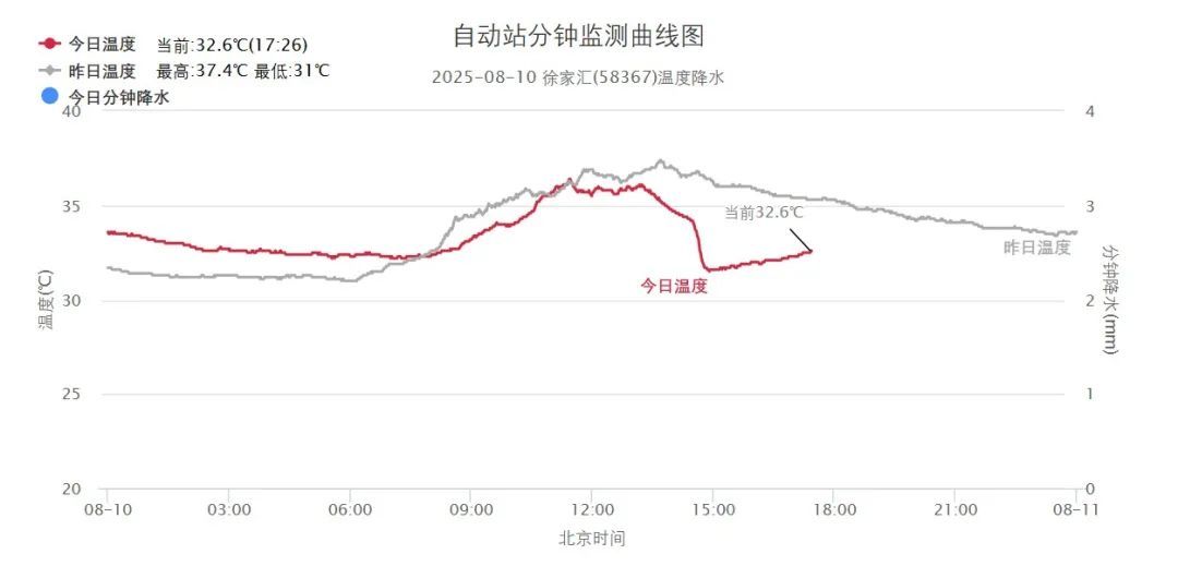 昨天中午前后,零散的雷雨云团东移,本市中北部地区率先经历风云突变,风大雨大,截至16时,崇明庙镇累积雨量38.0毫米为最大。下到雨的地方气温快速下降,徐家汇站一度降至31.5℃。