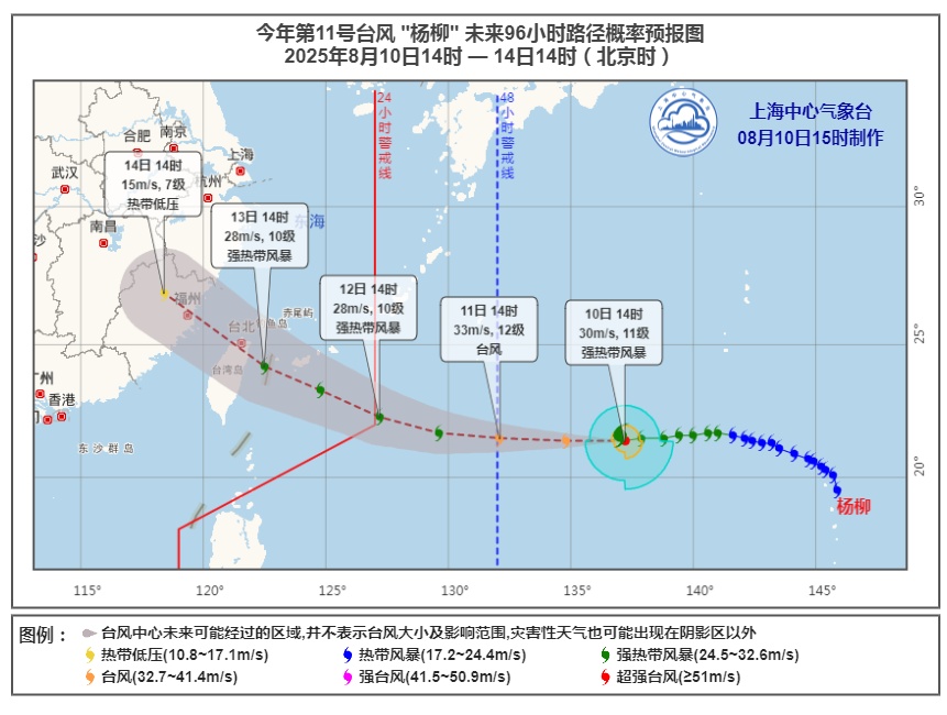 今年第11号台风“杨柳”(强热带风暴级)的中心10日14时位于台湾台北市东偏南方向约1650公里的西北太平洋洋面上,中心附近最大风力11级(30米/秒),中心最低气压980百帕,“杨柳”将以每小时20至25公里的速度向偏西方向移动,强度变化不大,并向台湾以东洋面靠近。