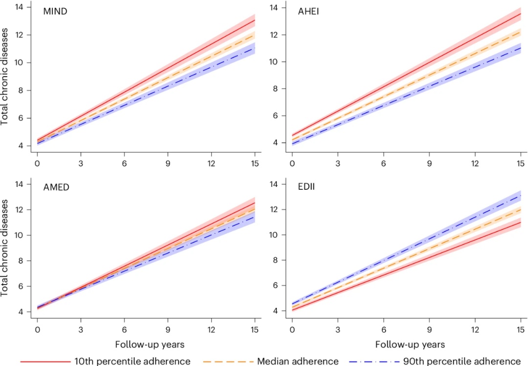 具体来说,每增加一个标准差的健康饮食依从性,MIND饮食能减少4.9%的慢性病积累,AHEI效果更优,达5.1%,AMED则为3.1%。相反,EDII每升高一个标准差,慢性病积累速度会增加5.3%。