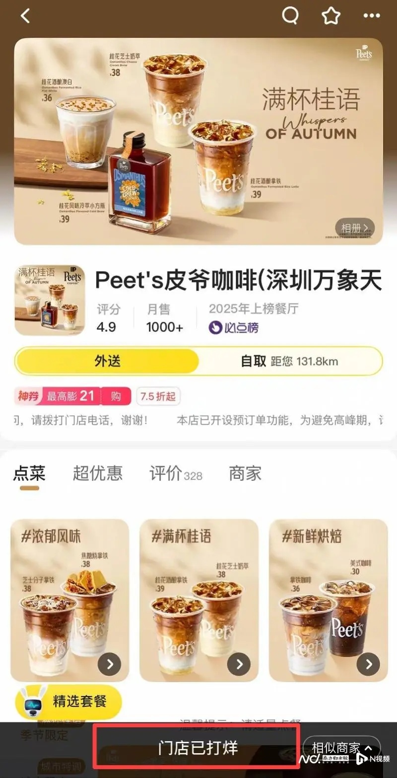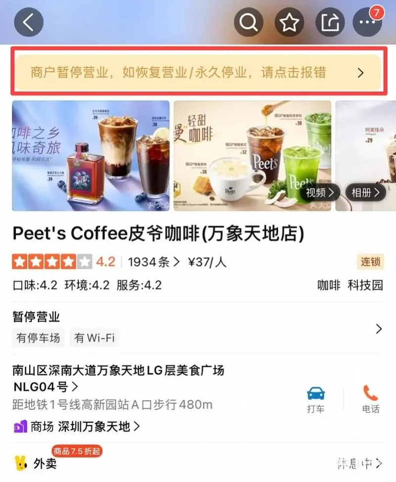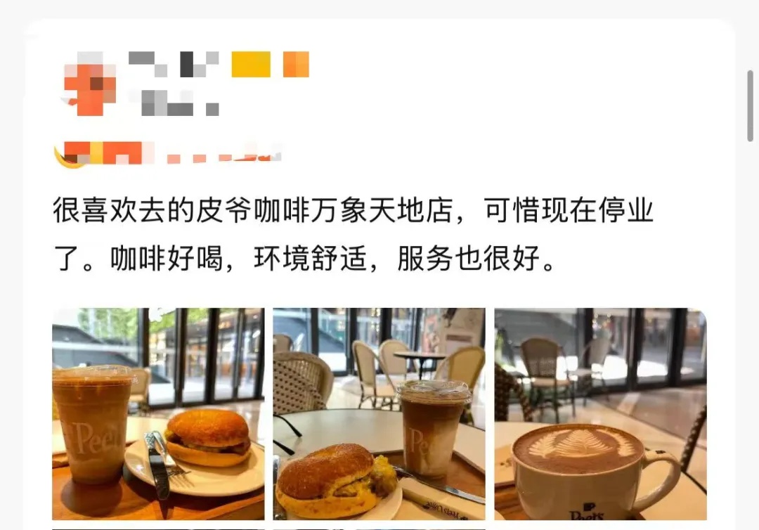 近日,全球知名咖啡连锁品牌皮爷咖啡(Peet’s Coffee)在华南地区的首店——深圳万象天地店已显示暂停营业,有消息称是因为租约到期后关店。