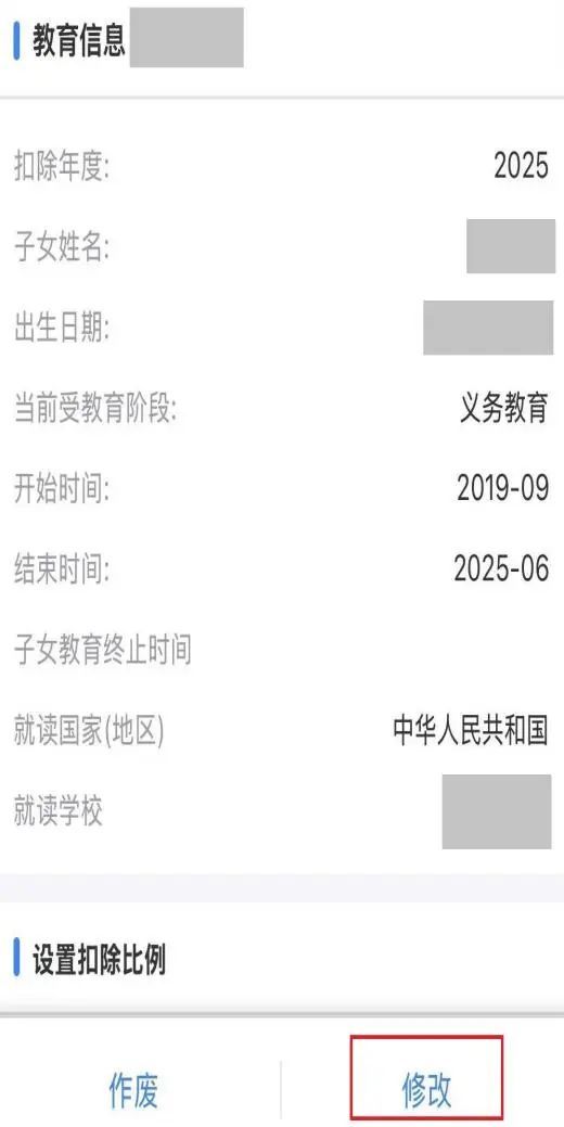 子女教育阶段发生变化的情形下,1.切忌直接修改原有的子女教育专项附加扣除信息,一定要按上述步骤新增一条教育阶段信息。例如直接将2025年1-8月的“高中阶段教育”修改为“大学本科”,会导致1-8月的数据被覆盖,无法享受对应阶段的专项附加扣除。2.新增一条教育阶段信息时,注意衔接。例如,高中教育结束时间填写至2025-08,新增大学本科开始时间为2025-09,确保高中教育结束时间与大学起始时间连续。
