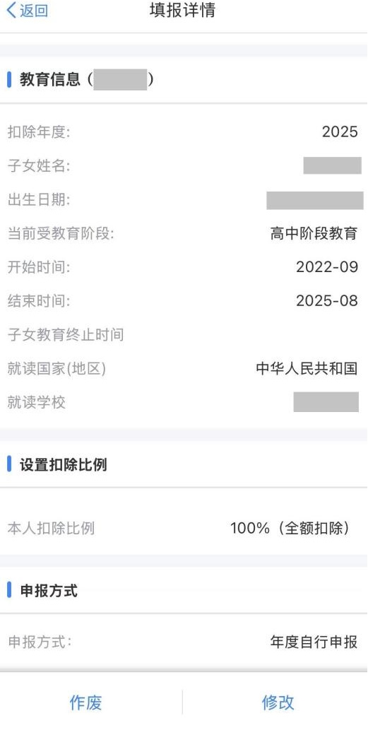 此时,本年度的“子女教育”专项附加扣除出现两条记录,一条是“高中阶段教育”,另一条是“大学本科”。
