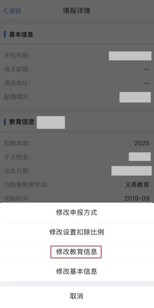 1.登录个人所得税App,点击下方【办&查】—【专项附加扣除】—【子女教育】,选择查询扣除年度“2025”,找到需要修改的子女教育专项附加扣除记录,点击【修改】—【修改教育信息】。