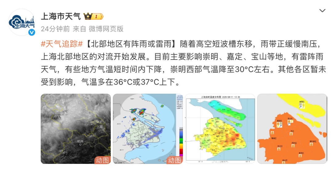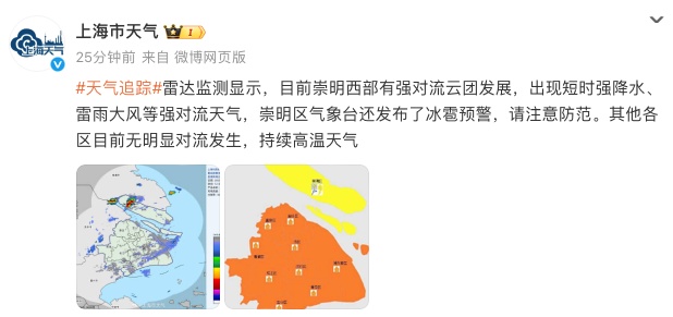 据上海市气象局消息:随着高空短波槽东移,雨带正缓慢南压,上海北部地区的对流开始发展。目前主要影响崇明、嘉定、宝山等地,有雷阵雨天气,有些地方气温短时间内下降,崇明西部气温降至30℃左右。其他各区暂未受到影响,气温多在36℃或37℃上下。