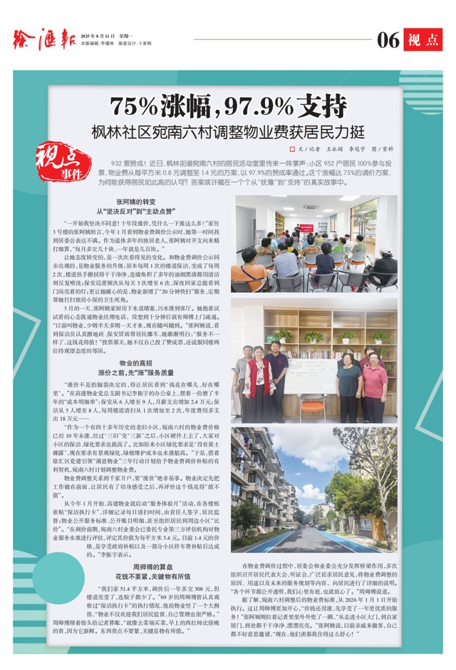 枫林社区宛南六村物业费上调,获97.9%超高支持!其秘诀在哪?物业落实“服务先行”: 在调价同时大幅提升保洁、安保、报修响应,让居民眼见为实。过程透明且引入专业评估,市价3.4元/平方米,仅调至1.4元/平方米,性价比突出。党建引领下设置体验期,新费2026年执行。“服务+定价+协商+保障”,打造出老旧小区调费典范。