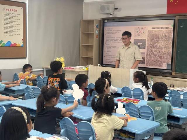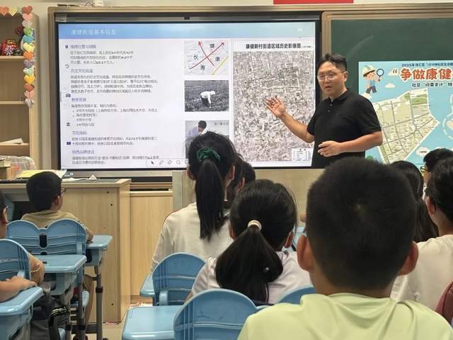 活动按低年级和高年级分班开展,康健街道社区规划师陈青长、阳毅、胡强强轮番授课。课堂上,规划师们先从康健街道的历史讲起,揭秘“康健”二字蕴含的“健康长寿”寓意。“我家在康宁坊!”“我住康乐小区!”“长青坊是我的家!” 孩子们纷纷举手互动,稚嫩的声音里满是对社区的熟悉与热爱。