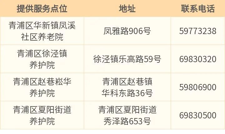 目前,青浦区已有华新镇凤溪社区养老院、徐泾镇养护院、赵巷崧华养护院、夏阳街道养护院4家机构可提供服务。市民可以通过电话联系机构预约、入户访问评估、建档签订合约、制定服务计划、实施服务、跟踪服务质量的方式申请相关服务。