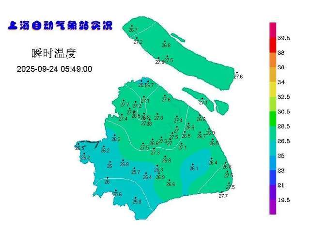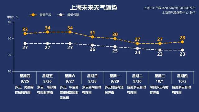 25日起副热带高压再次西伸加强,气温上升。预计周五、周六本市最高气温可至34℃,夏日体感重新上线。徐家汇站自1872年有正式气象观测数据以来,9月下旬(以后)仅出现过7个高温日。今年9月上海气温较往年偏高。