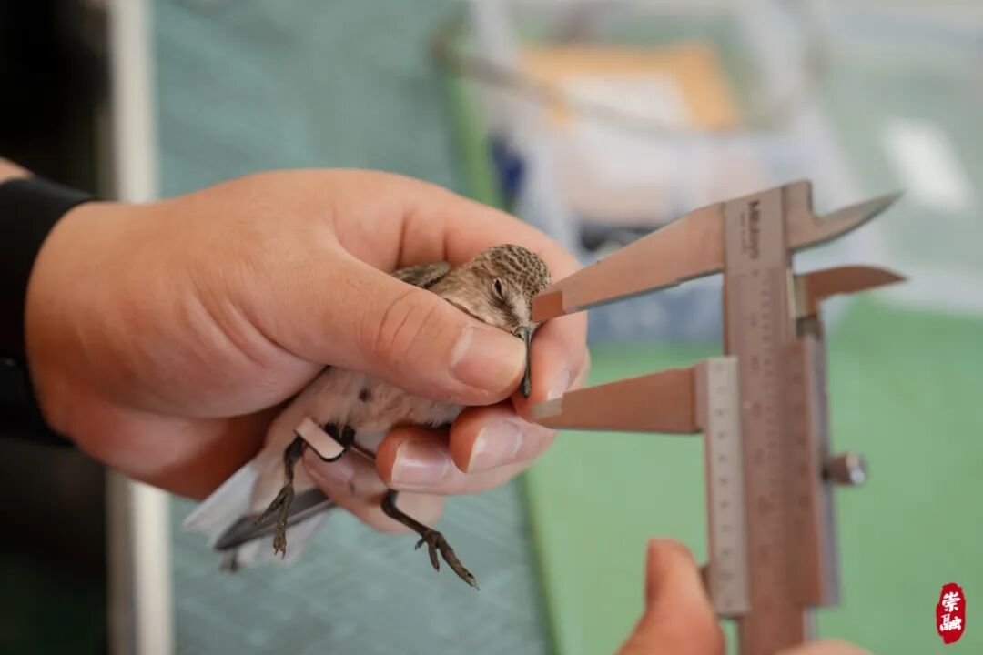 记者在东滩鸟类国家级自然保护区看到,一只蒙古沙鸻刚刚由工作人员通过“鸟哨”抓捕回来,送入保护区深处的环志站点。随后,工作人员先为鸟儿佩戴黑白旗标和带有编码的金属环,再逐一测量头喙、翅长、体重等数据,并做好记录。