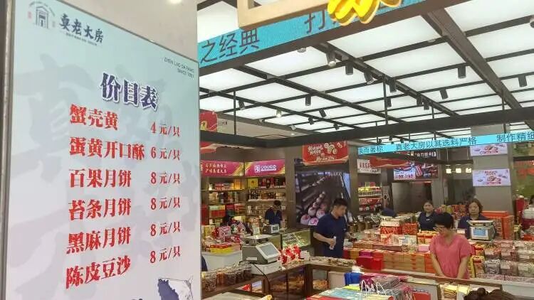 除了经典的鲜肉月饼和新推出的牦牛肉月饼、蟹粉鲜肉月饼,真老大房咸口的月饼还有南乳汁鲜肉月饼、蛋黄鲜肉月饼、榨菜鲜肉月饼、萝卜丝月饼,价格从4.5元到10元不等。甜口月饼方面,在之前豆沙月饼的基础上推出了全新的陈皮豆沙月饼。
