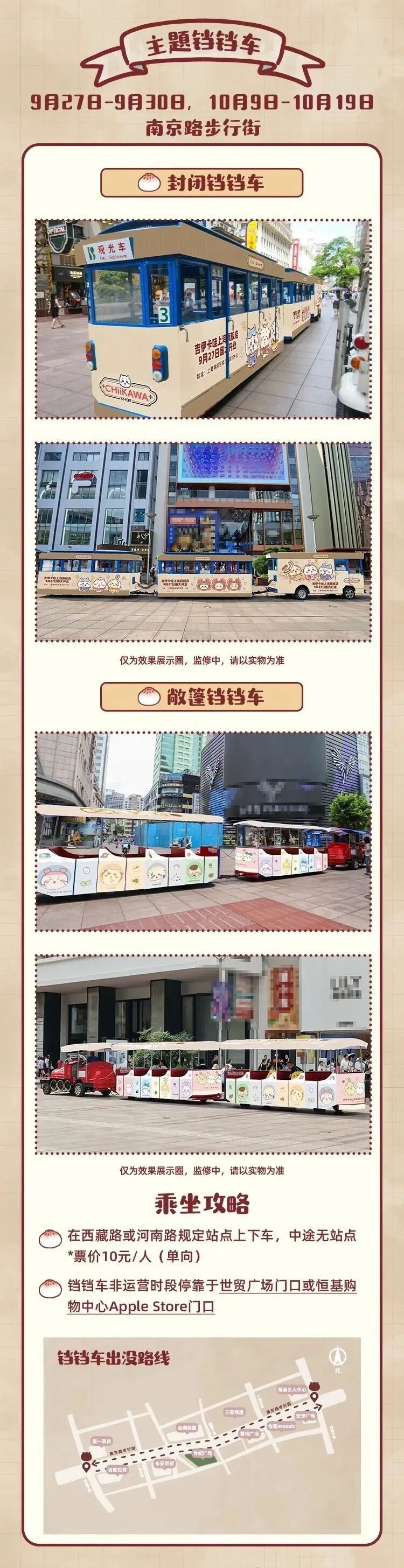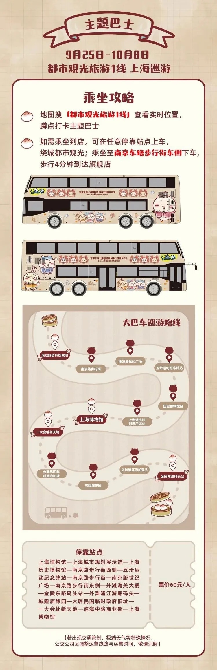 chiikawa专属巴士已登录上海,已经有小伙伴成功捕捉到它的身影啦! 即日起至10月8日,乘坐“都市观光旅游1线”至南京东路步行街东侧下车,步行4分钟就可以到达旗舰店。 除了主题巴士,南京路步行街上的“铛铛车”也即将“变身”哦!