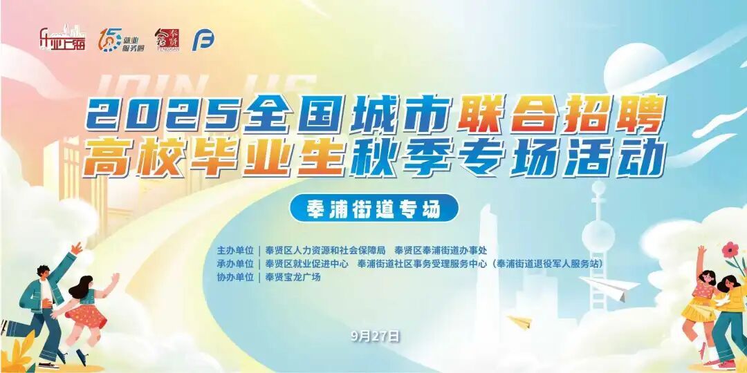 为更好促进高校毕业生和群众就业,满足企业用工需求,奉浦街道将于9月27日(周六)13:00在奉贤宝龙广场举行“2025年全国城市联合招聘高校毕业生秋季专场活动(奉浦街道专场)”。