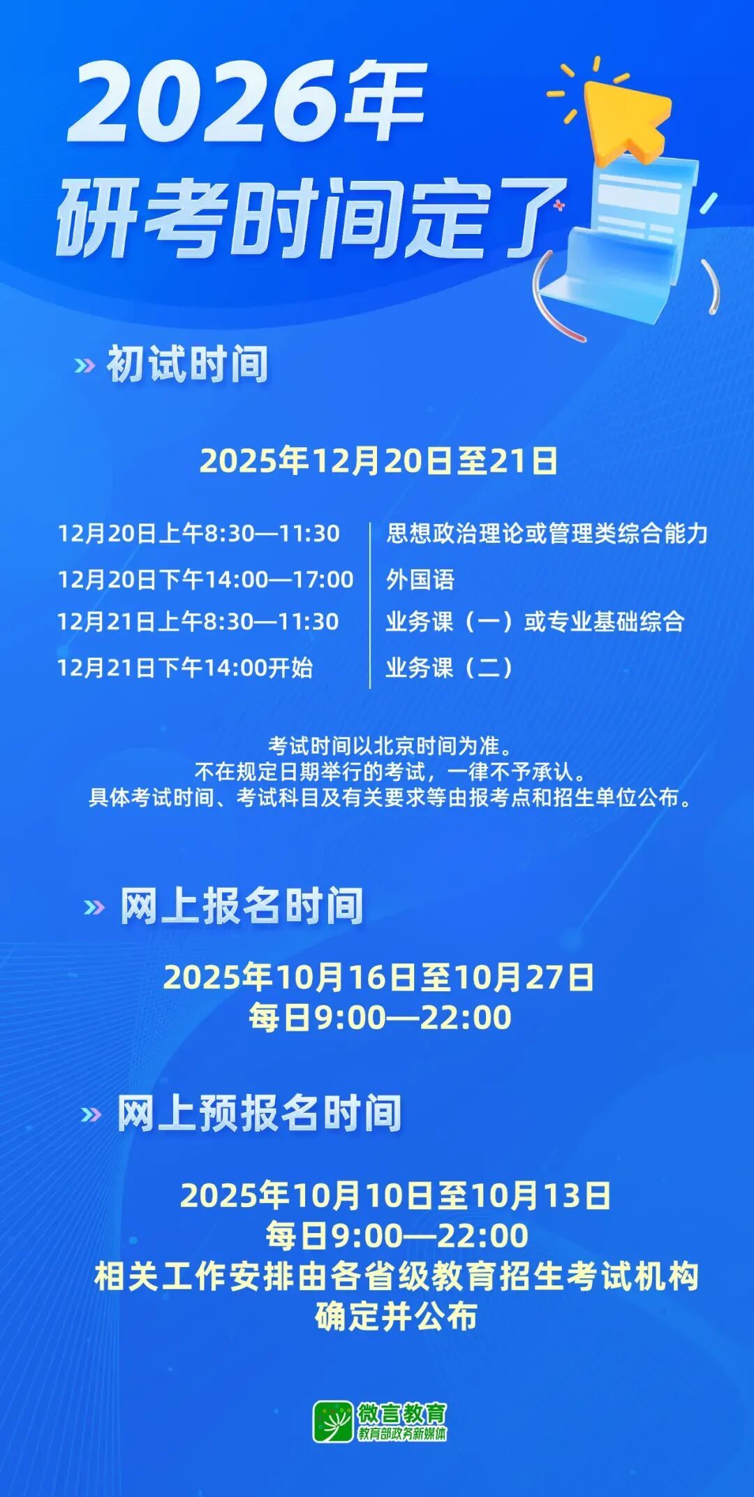 《规定》明确,2026年全国硕士研究生招生初试时间为2025年12月20日至21日。网上报名时间为2025年10月16日至10月27日(网上预报名时间为2025年10月10日至10月13日,相关工作安排由各省级教育招生考试机构确定并公布),每日9:00—22:00。网上报名结束后,各省级教育招生考试机构将组织网上确认工作,对考生报名信息进行审核。所有考生均须在规定时间内参加网上报名和网上确认,逾期不再补办。