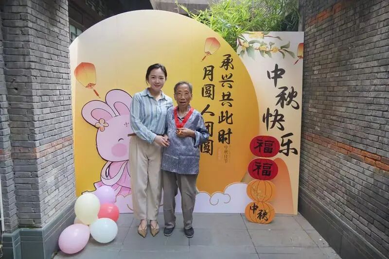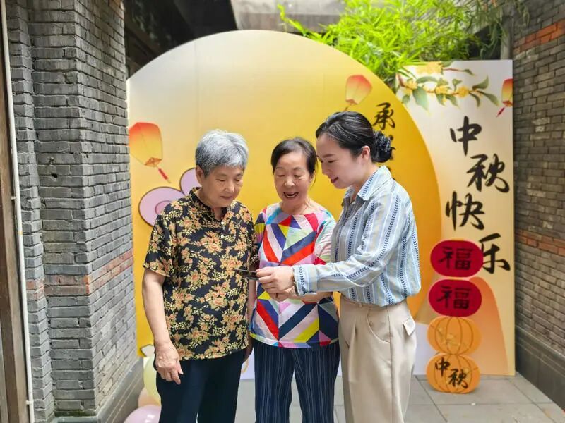 有的居民在搬走之前,特意盛装打扮,在兼具石库门和中秋节元素的布景前拍个全家福。有的老人虽然早早搬走,但听到消息,特意在儿女的陪伴下赶回来过节,像往年一样,和邻里街坊叙旧,和曾经给过他们诸多关怀的居委干部们合影留念。