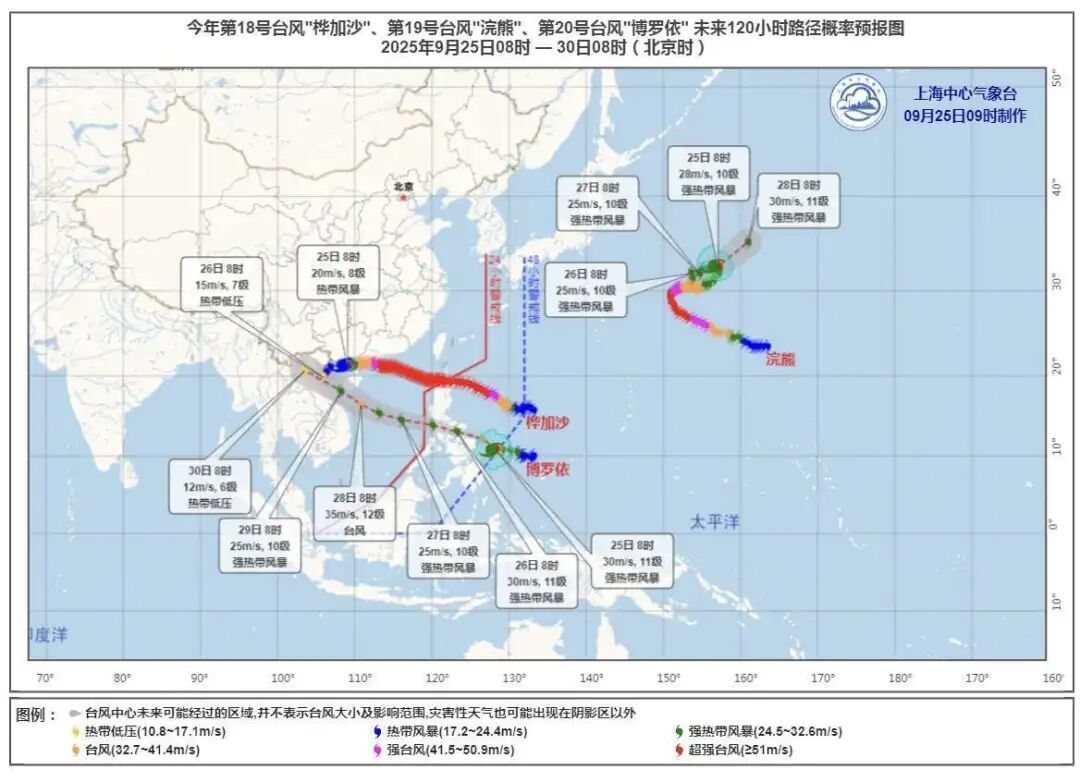 目前,南海和西北太平洋区域有“桦加沙”“浣熊”和“博罗依”三个台风活动。“桦加沙”已于今天(25日)早晨减弱为热带风暴级,主要影响广西和海南等华南沿海地区。其他两个台风也对本市无直接影响。