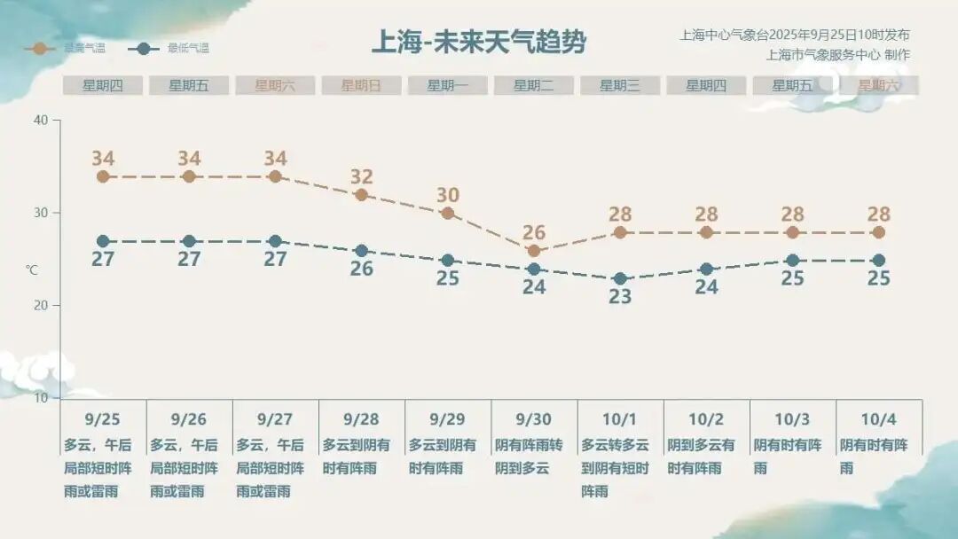 随着副热带高压加强西伸,申城今天(9月25日)以多云为主,升温势不可挡,日最高气温冲达34℃,逼近35℃高温线。今日东南风4~5级,相对湿度90%~55%,体感湿热。由于升温迅速,能量充足,今天的午后到夜里,局部地区将迎来短时热雷雨,请市民们关注最新的预报预警信息。