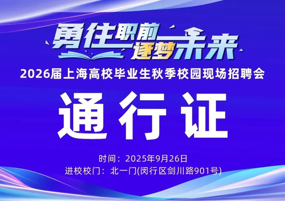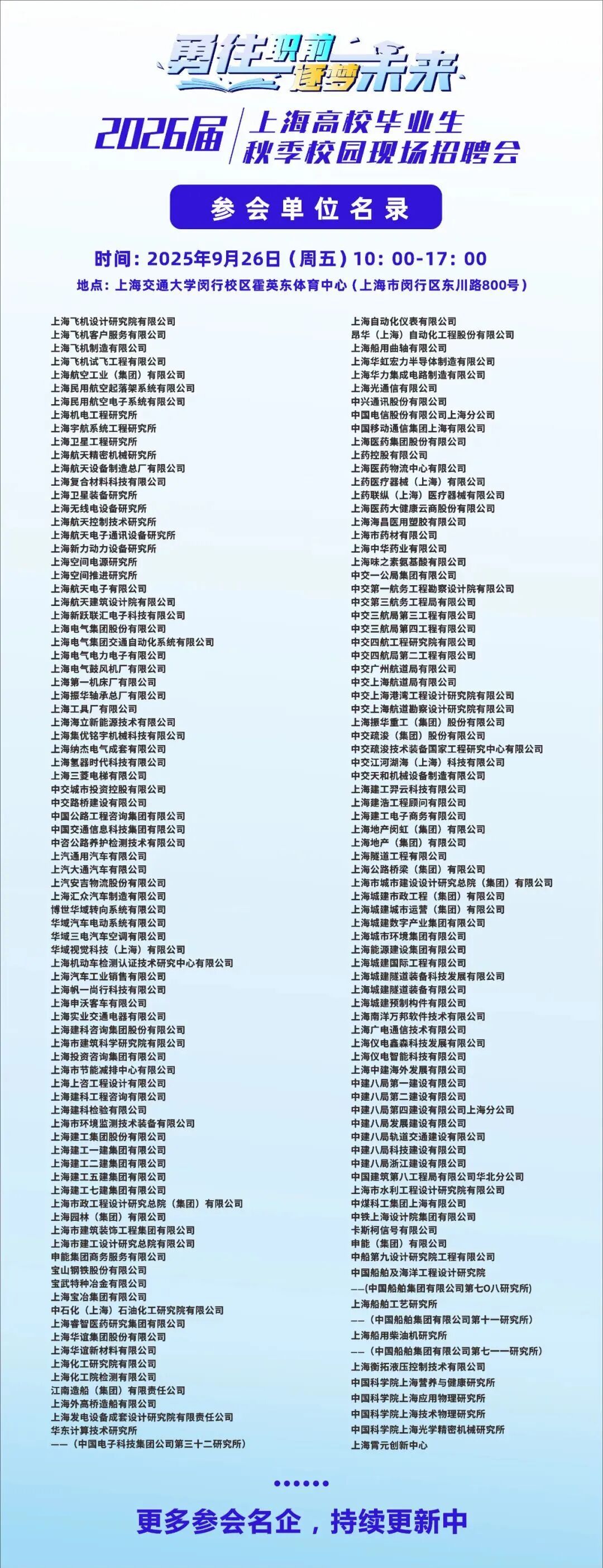 市教委介绍,2026届上海高校毕业生秋季校园现场招聘会将于9月26日(周五)10:00-17:00在上海交通大学闵行校区举行,现向上海市及长三角地区2026届高校毕业生发出活动邀请函,一起来看↓ 一、活动亮点抢先看 1. 区域协同,机遇无限:深化长三角就业联盟协作机制,汇聚长三角区域各省市的优质企业资源,带你一键解锁跨区域发展机会! 2. 千企齐聚,职海淘金:现场汇聚1000+企业现场招贤纳士,名企荟萃,海量优质岗位总有一个属于你! 3. 线上线下,双轨联动:现场直面HR拿下心仪Offer,线上平台招聘持续一个月,助你从容筛选、无忧投递! 二、招聘会时间 2025年9月26日(周五)10:00-17:00 三、招聘会地点 上海交通大学闵行校区霍英东体育中心(上海市闵行区东川路800号) 四、组织单位 指导单位: 中共上海市教育卫生工作委员会、上海市教育委员会、上海市人力资源和社会保障局 主办单位: 上海市学生事务中心、上海市人力资源公共服务中心、上海交通大学 支持单位: 上海市各高校 五、参会学生 主要面向上海市及长三角地区2026届高校毕业生,不限学校及专业。 六、预约参会 想要参加本次招聘会的同学可以通过随申办市民云APP扫描下方二维码选择本场招聘会进行预约~ 七、进校通行证 保存下方图片即可获取本场招聘会进校通行证。 八、交通路线 本次招聘会在上海交通大学(闵行校区)霍英东体育中心举行,参加招聘会的同学需从北一门(剑川路901号)入校。市内公共交通可选择轨道交通5号线在剑川路地铁站下车,经剑川路由北一门入校;或乘坐轨道交通15号线在紫竹高新区地铁站下车,经莲花南路、剑川路由北一门入校。 温馨提示 1. 本次招聘活动采用“线上+线下”相结合的形式,无法亲临现场的同学不要气馁!招聘会当天,我们将把线下招聘会的全部职位信息,同步在上海24365大学生就业服务平台(www.firstjob.shec.edu.cn)。点击学生服务-网上求职,查看本次招聘会的在招职位吧~。 2. 请各位同学提前规划行程,绿色出行。 参会单位名录 参会企业新鲜出炉 快来看看有没有心仪的企业吧!