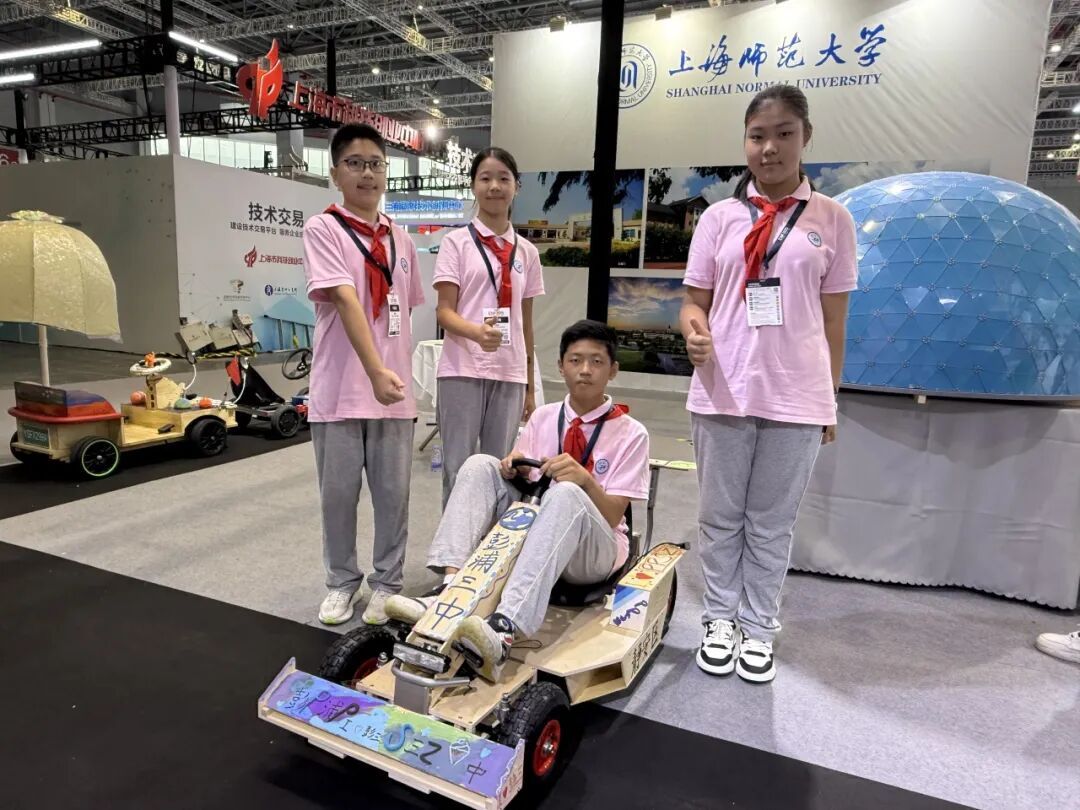 展台上,静安区教育学院附属学校的几位学生带来了自己研制的一款未来概念的太空车,该作品获得了2025年“第十一届全国青年科普创新实验暨作品大赛”上海赛区的二等奖。