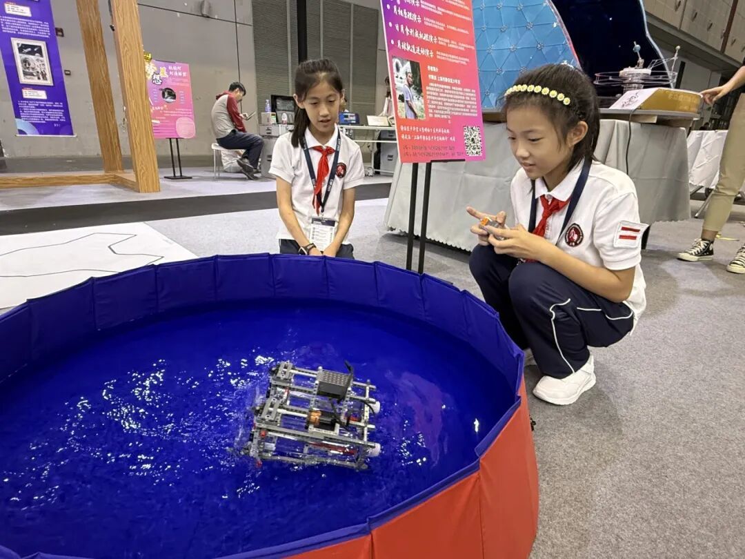 “通过遥控,这个装置可以在水面上漂起来,我们安装了两个饮料瓶,来增加它的浮力。”来自静安区大宁国际小学的五年级女生潘果惟和张琪芸在水池里演示着在机器人社团中的学习和实践成果,“我们对学长学姐的作品进行了升级改造,之前,它只能在陆地上走,现在能在水上走了,其中涉及了浮力、机器人结构等科学知识,非常有意思。”