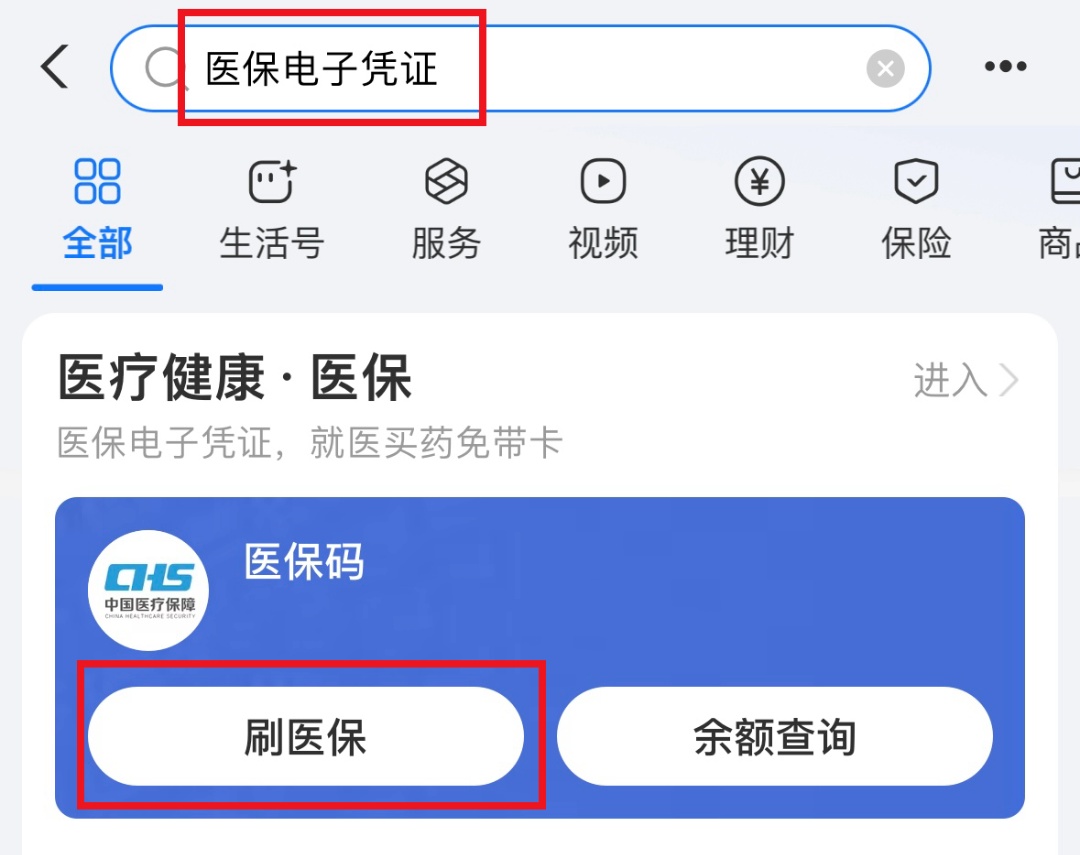途径二:打开“支付宝”APP,首页搜索框,搜索“医保电子凭证”激活使用,如图所示操作: