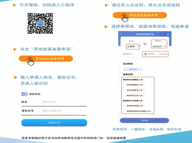 “国家异地就医备案”微信小程序(实名认证、本人办理)或“国家医保服务平台”APP(实名认证、本人办理或为他人办理)——“参保地”选择“上海市”——“就医地”根据实际情况选择——备案成功后凭本市新版社保卡或电子医保码在当地异地联网定点医疗机构实现门诊、住院直接结算。