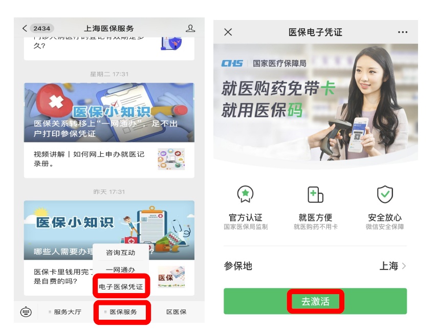 途径一:微信扫码关注“上海医保服务”公众号,点击“医保服务”——“电子医保凭证”——“去激活”并使用,如图所示操作: