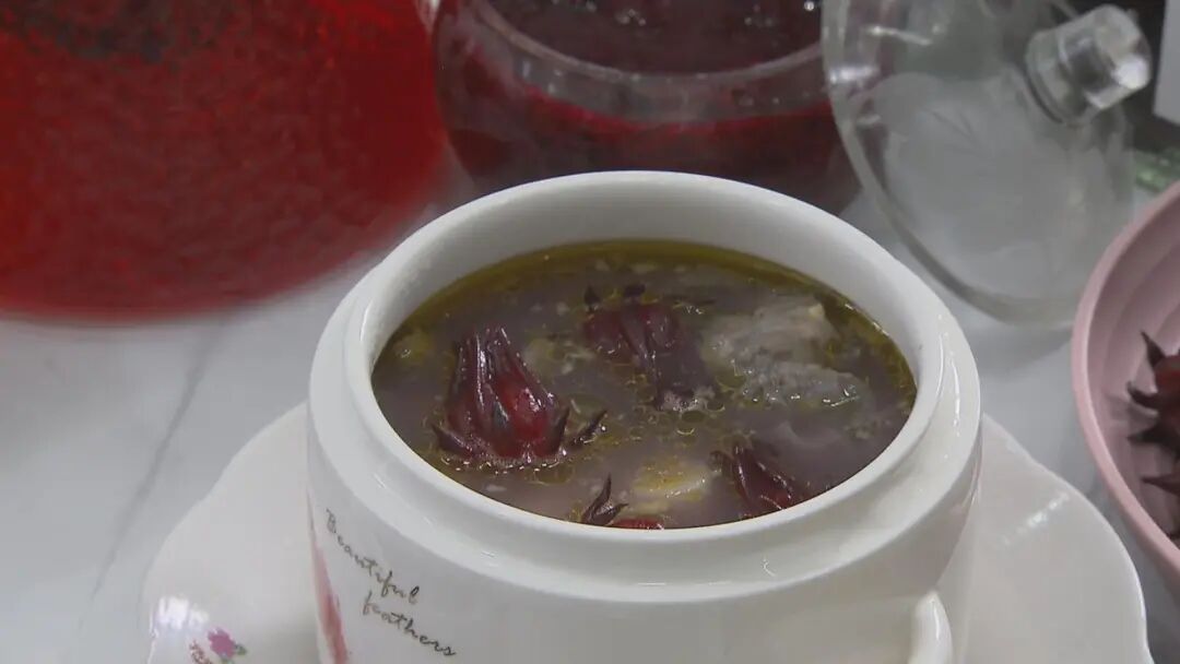 在此次创意实践中,周周制作了洛神花山药排骨鸡汤、洛神花银耳羹以及洛神花蛋炒饭三道菜品。她介绍,洛神花口感带酸,能起到天然的调味作用。在炖汤时,只需在汤盅内放入三五颗洛神花与肉类、山药同炖,汤品便会增添一丝不易察觉的酸香,口感层次更为丰富。而制作银耳羹时,则先用洛神花熬出红色汤汁,再与银耳、冰糖同煮,制成酸甜可口的养生甜品。至于蛋炒饭,则在起锅前撒入切碎的洛神花稍作翻炒,既点缀色泽,又增添风味。