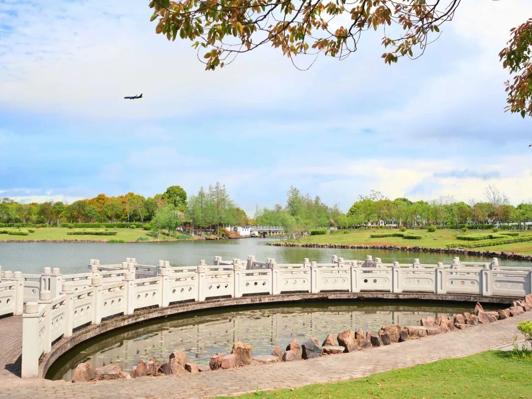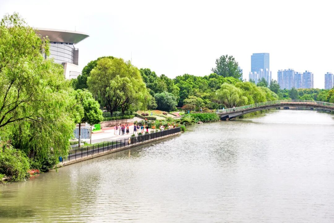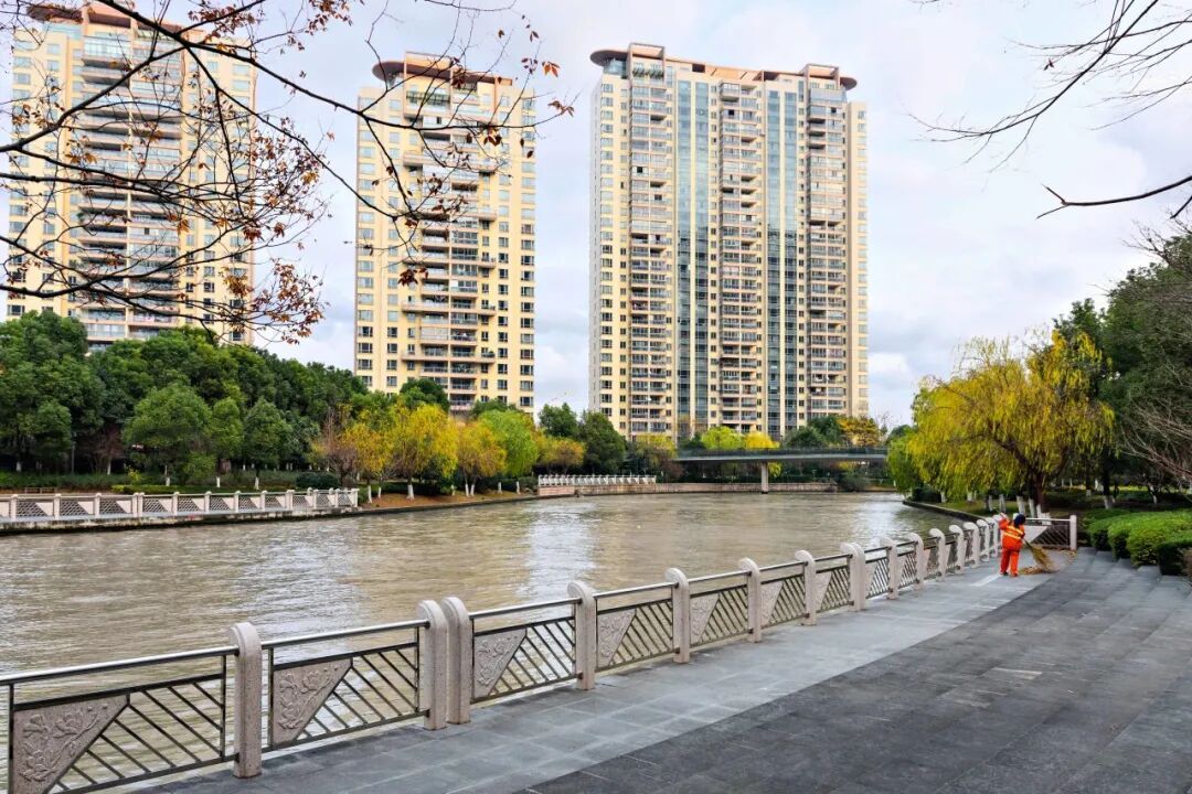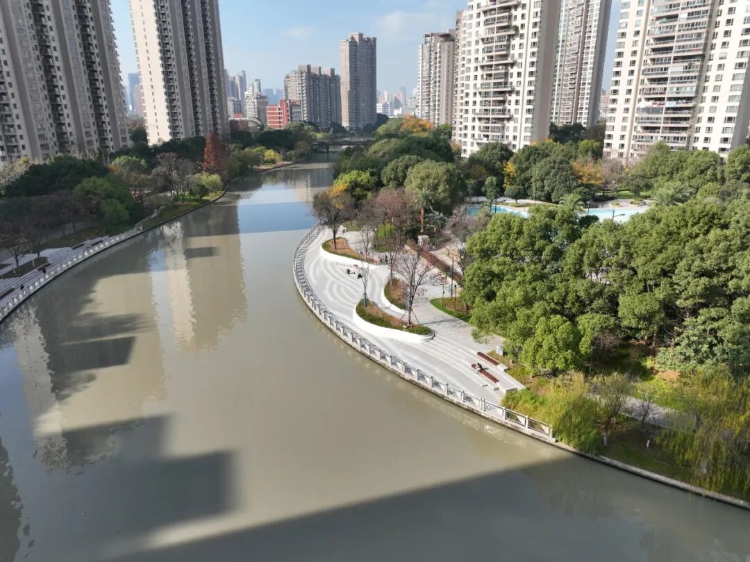 亲水平台位于三八河(杨高中路-罗山路)两岸,沿河而建,河道贯穿仁恒河滨城。平台与岸上绿植形成柔和自然的视觉界面,并与陆家嘴金融区现代风貌形成对比,提供了“闹中取静”的休闲空间。同时,这里紧邻140万平方米的世纪公园,形成“公园+河畔”的双景交融生态空间。作为仁恒河滨城的核心景观节点,平台连通小区内部步道,居民可在此散步、观景,享受“推窗见水”的宜居体验。