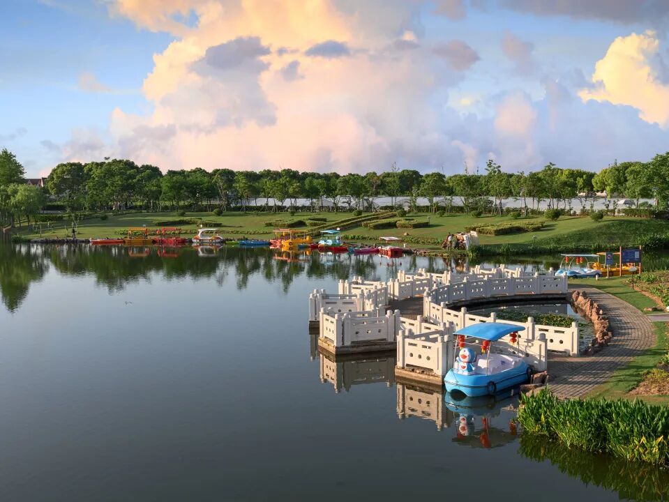 亲水平台位于五灶港河畔的鹿湖路沿岸,毗邻玫瑰园与民宿区,是水岸景观带的重要节点。平台设计采用半圆形花岗石结构,与草坪斜坡和栈道相结合,共同构成了阶梯式的亲水空间。作为连民村“水生态修复+文旅开发”的缩影,该平台兼具科学治水示范(如沉水植物净化)、文化传承(盐运历史、玫瑰产业)与休闲教育功能,生动诠释了“人水和谐”的乡村可持续发展模式。