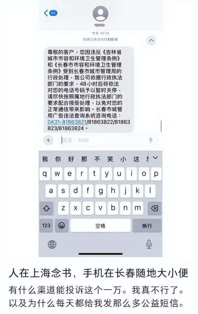 尊敬的客户,您因违反《吉林省城市市容和环境卫生管理条例》和《长春市市容和环境卫生管理条例》,受到长春市城市管理局的行政处理,我公司依据行政执法部门的要求,48小时后将依法对你的电话号码予以暂时关停,请尽快按照属地行政执法部门的要求,配合接受处理,以免对你的正常通信带来影响。此外上面还公布了长春市城管局广告违法查询系统咨询电话号码。