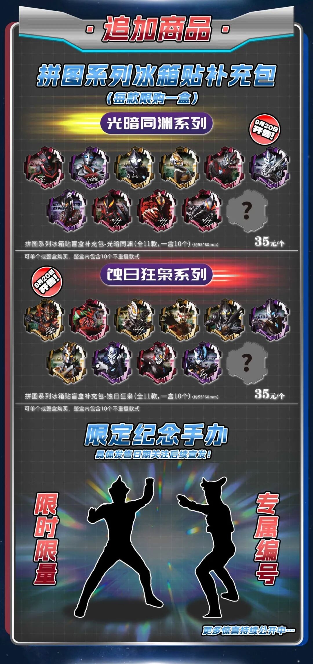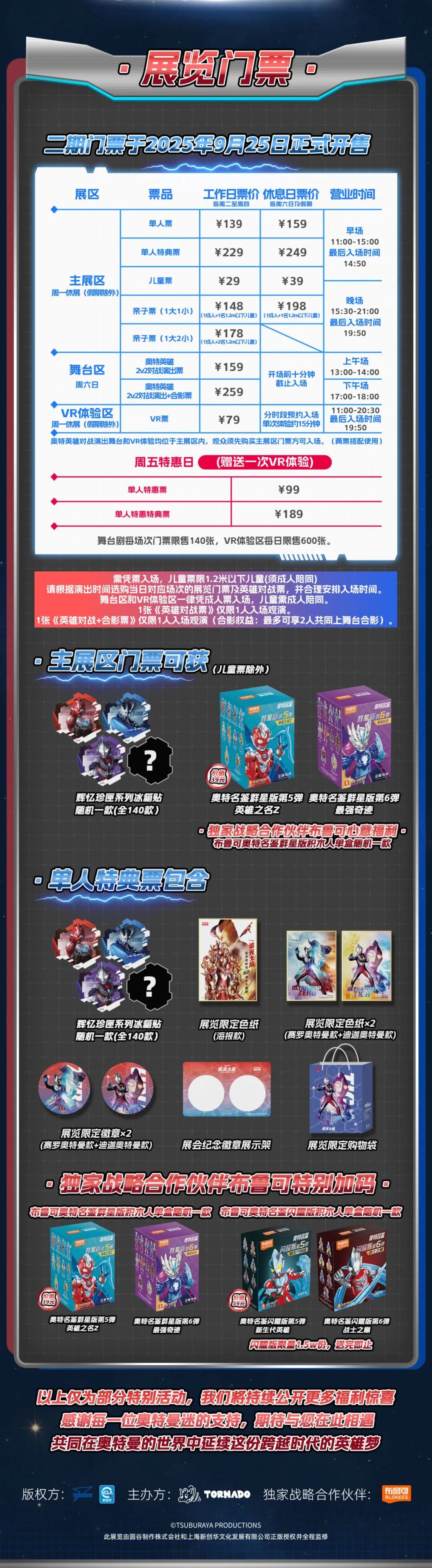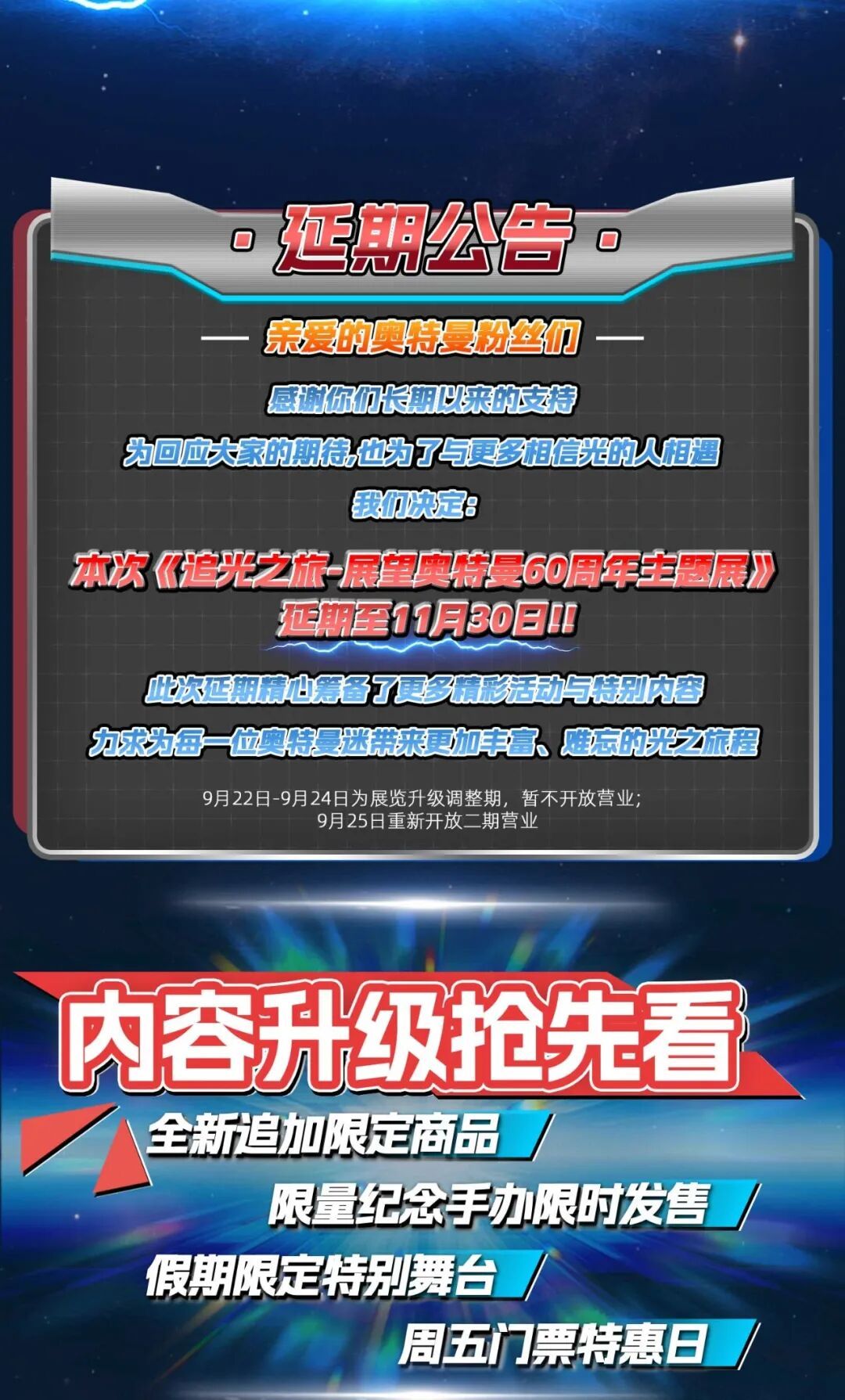 今天让我们一起走近“追光之旅”展望奥特曼60周年主题展,将延期至11月30日,全新追加限定商品——拼图系列冰箱贴补充包,9月20日正式开售!10月4日至10月7日,众多英雄集结登场,强势阵容跨次元空降!9月25日至11月30日期间的工作日周五,特惠票火热开抢,赠送VR体验,提前拉满周末期待值。