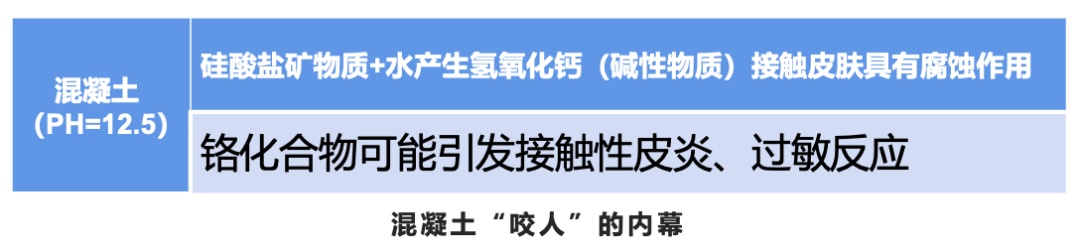 高温天气容易出汗,干性混凝土颗粒沾染皮肤后和汗液发生反应,出现灼伤疼痛、红肿或瘙痒;需和混凝土中的铬化合物可能引发的接触性皮炎、过敏反应区别开。过敏反应时仅使用抗感染药膏(如美宝烫伤膏、磺胺嘧啶银软膏等)可能会进一步加重局部皮肤红肿、瘙痒甚至糜烂。