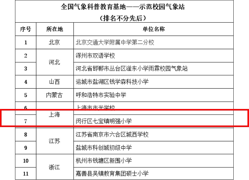 近日,中国气象学会传来喜讯,闵行区七宝镇明强学校被成功认定为“全国气象科普教育基地”,为闵行区科普教育增添一枚“国字号”招牌。