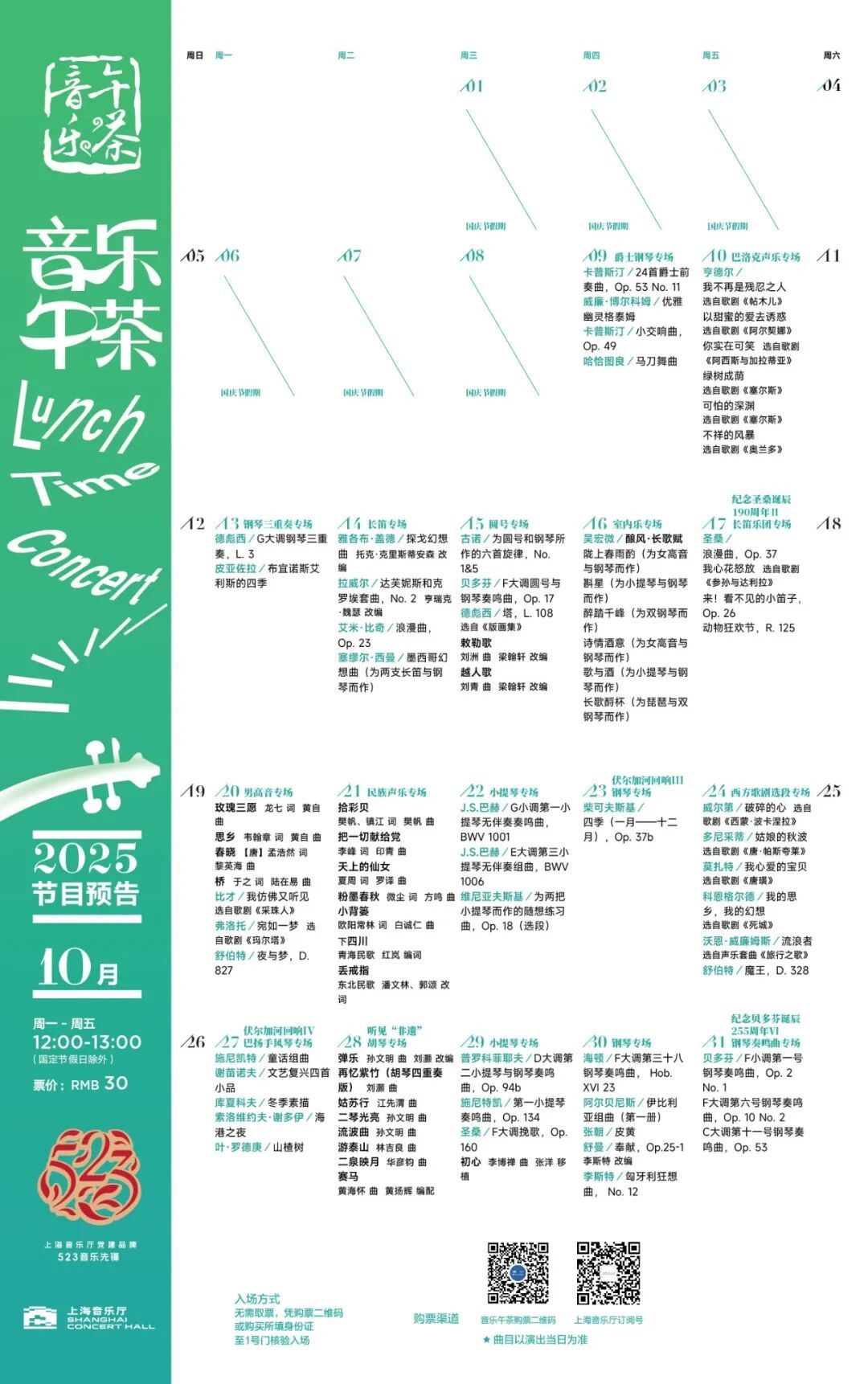 金秋十月,上海音乐厅的“音乐午茶”为您编织一场声音的秋日诗集——从俄罗斯的四季岁月,到民乐“非遗”的丝弦回响;从巴赫复调里的金色麦田,到爵士即兴中的咖啡馆细雨…每个工作日午后12点,用一杯咖啡的时间,让耳朵开启治愈系旅行。