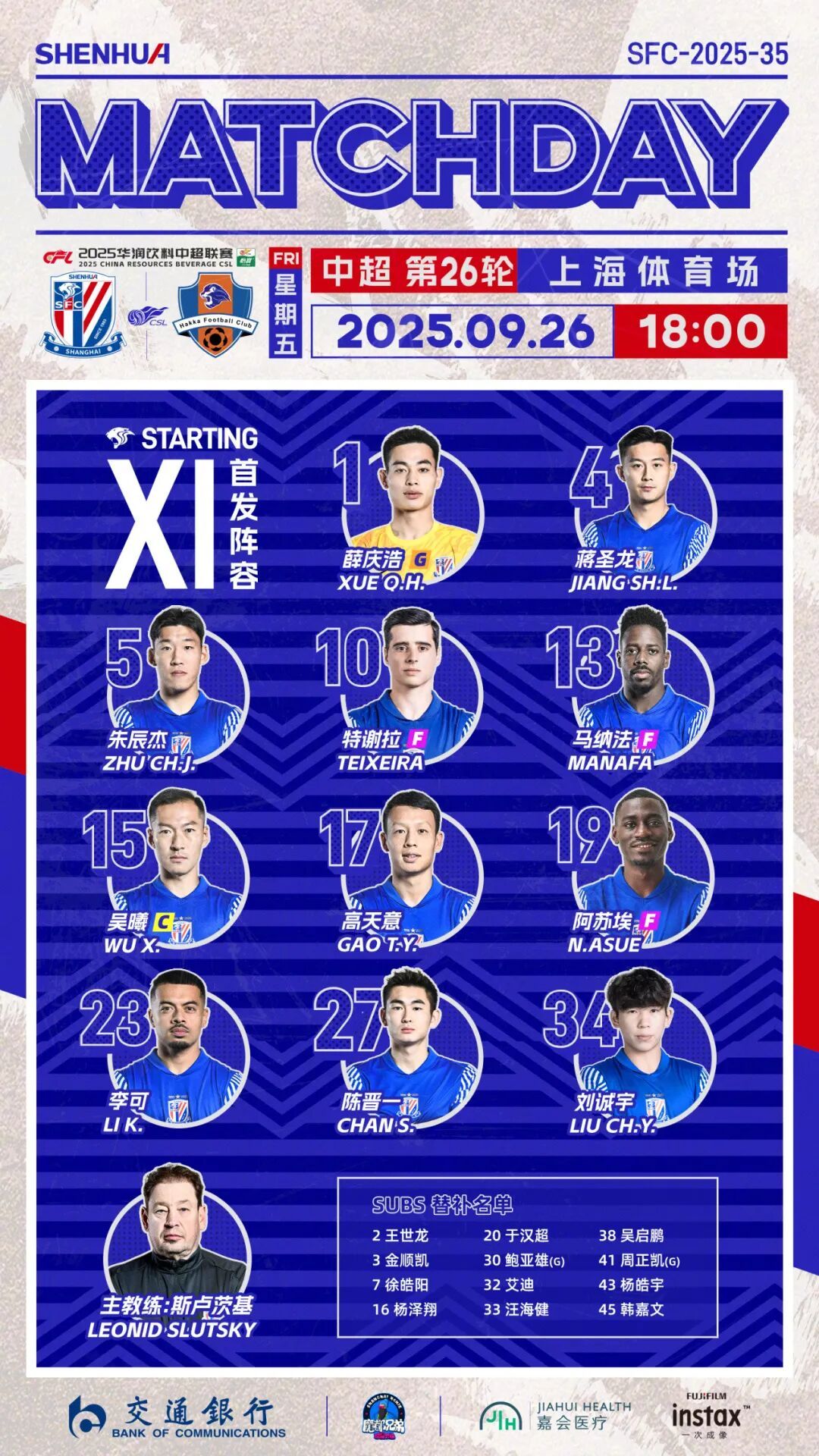 上海申花首发:1-薛庆浩、4-蒋圣龙、5-朱辰杰、13-马纳法(F)、27-陈晋一、23-李可、10-特谢拉(F)、15-吴曦、17-高天意、19-阿苏埃(F)、34-刘诚宇