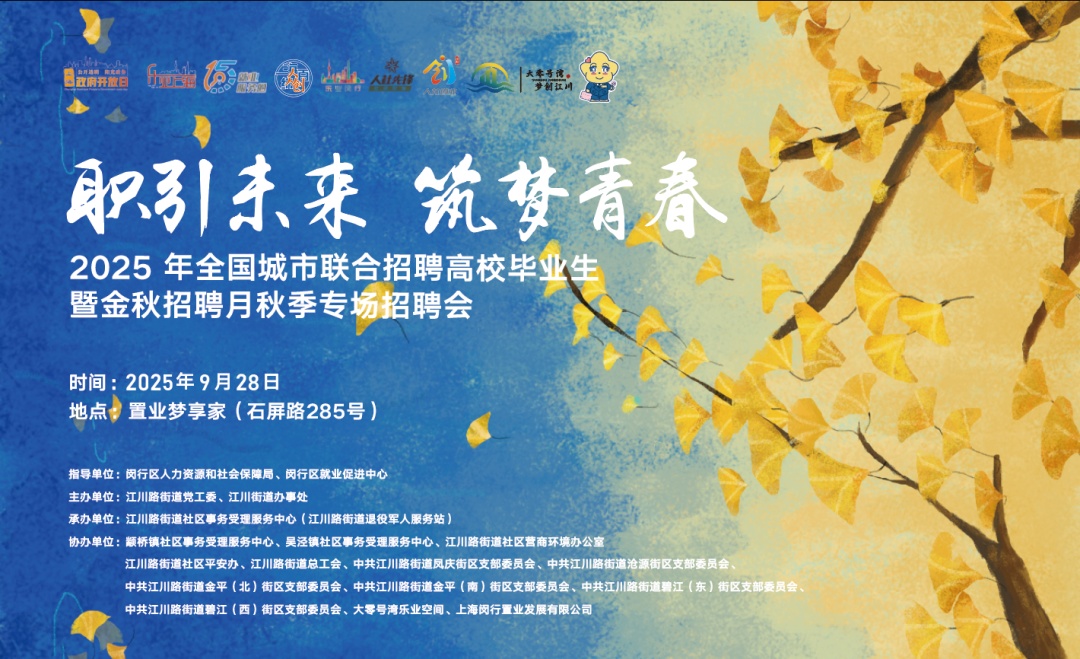 -全城寻找发光发热的你- 秋季海量岗位 精准对标服务 秋招黄金机会来啦! 职引未来 筑梦青春 2025年全国城市联合 招聘高校毕业生 暨金秋招聘月秋季专场招聘会 9月28日准时开锣 帮你近距离对接优质企业! 先划重点:这场秋招会有多香? 40家江川热门企业集结 40家江川热门企业,覆盖智能科技、医药健康、高端制造等领域,既有飒智智能、恒瑞医药这样的行业“大牛”,也有稷以科技、亿索科技等潜力企业,选择超丰富! 120个优质岗位任选 120个优质岗位,从软件开发、机械工程师到医药研发、质控岗,还有销售、运营等通用岗位,不管你是技术型人才还是综合型人才,都能找到适配方向! 线下直面HR 现场企业HR一对一沟通,问岗位、聊发展,甚至有机会当场获得复试邀约,求职效率直接拉满! 部分企业&岗位,提前“锁定”! 科技领域:上海飒智智能科技聚焦具身智能技术研发,计划招聘机械设计、软件、算法工程师等技术岗;上海稷以科技、上海亿索科技则围绕信息技术服务、系统集成等业务,释放临时半导体设备生产计划员助理、专利专员兼研发助理等岗位。 医药健康领域:上海恒瑞医药、上海上药第一生化药业延续行业优势,除分析员、技术员、质控岗外,还有立项高级研究员、PMO专员、生测组检验专员等岗位,兼顾医学、药学、生物工程等专业需求。 高端制造领域:上海电气上重碾磨特装设备有限公司作为上海电气集团旗下企业,专注于重型碾磨设备研发制造,此次招聘数控设备操作工、产品装配工等岗位,为专科毕业生提供对接国企优质资源的机会;上海神明电机则针对电子产品生产,招聘生产计划管理员等岗位,注重实操能力培养。 关键信息收好,别跑空! 招聘时间:9月28日(周日)14点 招聘地点:置业梦享家(石屏路285号) 交通贴士:建议绿色出行,地铁5号线东川路站下,往南侧步行5分钟 携带物品:个人简历(建议多备3至5份)、成绩单/获奖证书复印件等 快速通道:扫描下方二维码关注获取更多就业信息! 易就业微信公众号 易就业小程序 乐业上海第一站 乐业闵行
