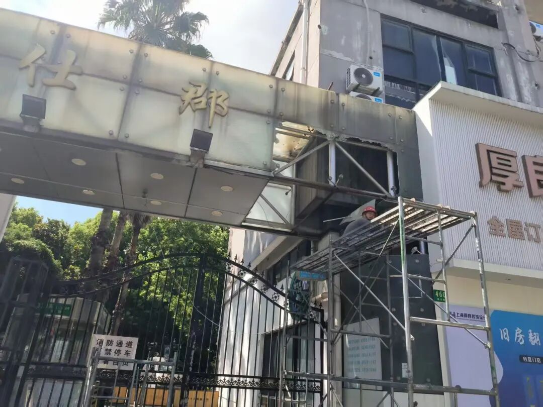 泊仕郡小区建于2009年,由于小区业委会正在换届,公共设施的维修暂时“断档”,北门门头的安全问题成为社区居民的一块“心病”,亟待解决。原来,门头玻璃布满蛛网般的裂痕,金属框架锈蚀变形,大风天甚至能听到玻璃晃动的声响。居民往来路过都忍不住加快脚步,不少居民也频频向物业和居委会反映。安全隐患摆在眼前,但缺少业委会、无法动用维修资金,“问题大门”的维修陷入僵局。