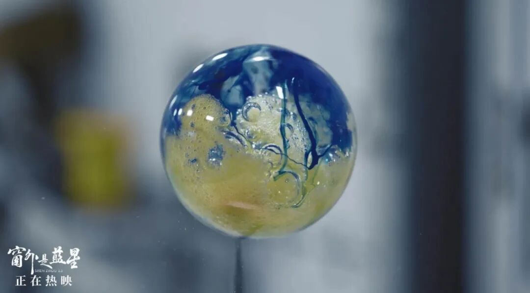 影片运用了国产8K超高清摄影机,在描绘宏观地球景观时,镜头从空间站舷窗缓缓拉出,云朵在静默中流转,陆地的脉络蜿蜒千里;在聚焦空间站细微之处时,王亚平将一颗泡腾片放进水珠,一缕缕蓝在水珠中的流动清晰可见,仿佛能看到人类所有的文明、记忆,都寄存于这一滴流动的蓝。