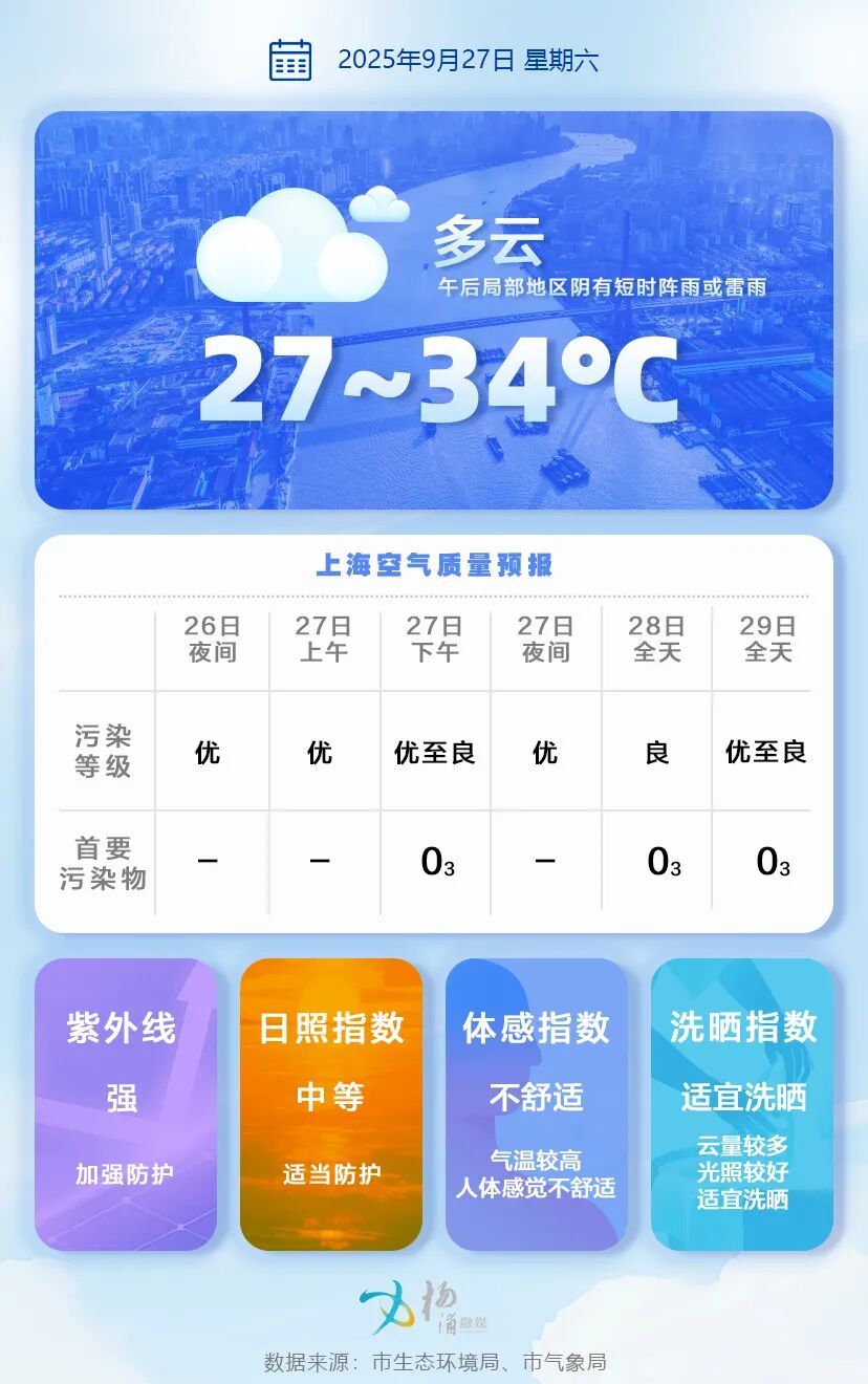 今天多云,午后局部地区阴有时有阵雨或雷雨。东南风3-4级,沿江沿海地区4-5级。最高气温34℃,最低气温27℃,相对湿度50%-95%。