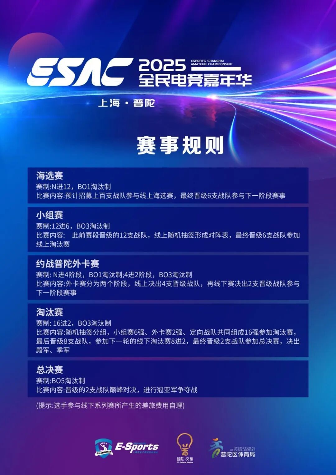 2025全民电竞嘉年华即将震撼登陆上海普陀,其中的重要板块——第六届电竞全民锦标赛现已启动报名。本次活动由上海市电子竞技运动协会、上海市普陀区文化和旅游局、上海市普陀区体育局联合主办,除了电竞全民锦标赛,更将带来两场全民狂欢的线下主题嘉年华!赛事报名通道现已开启,于10月至11月初全面打响,以电竞之名点燃金秋十月的激情与活力!