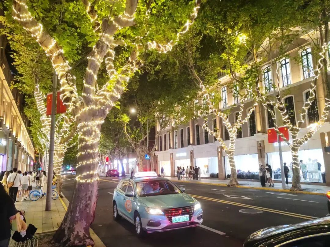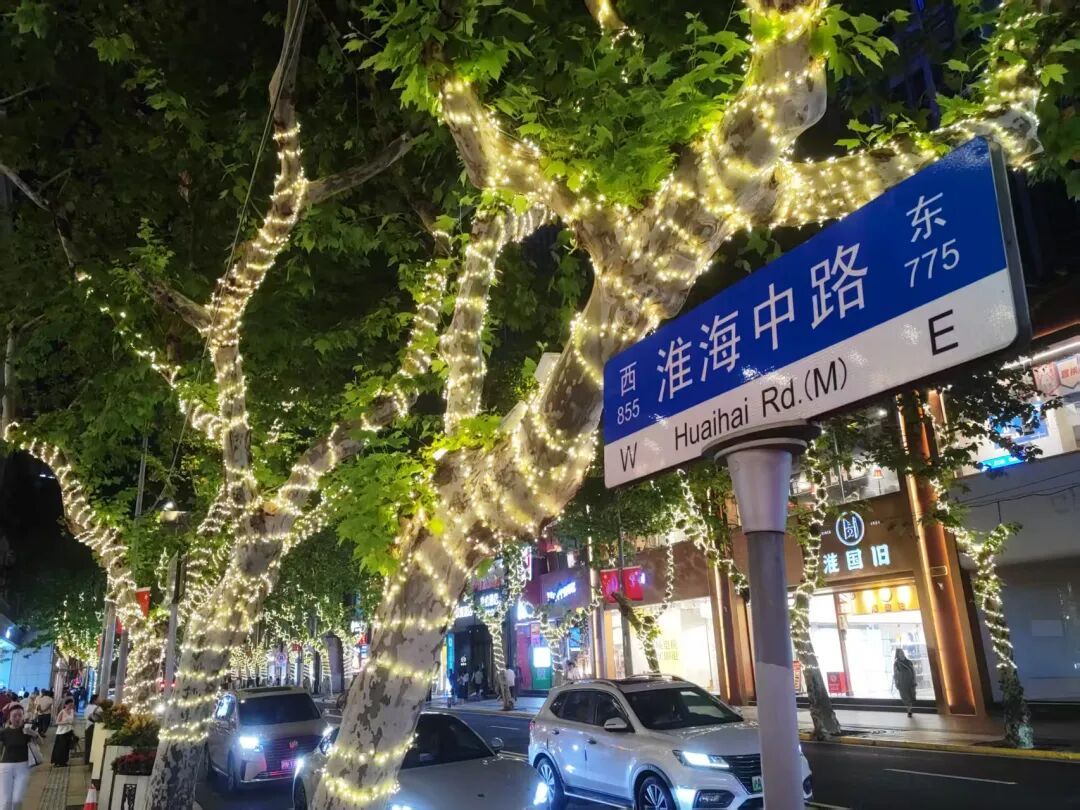 随着淮海中路两侧树灯、建筑立面灯光与装饰灯饰倏然亮起,将百年淮海中路装扮成一条熠熠生辉的“光影长廊”。
