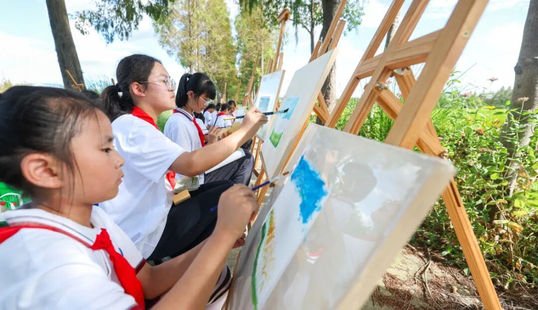 “户外的颜色比画纸丰富太多了!”六年级学生朱炫迪看着自己的作品面露喜色地说,“画纸上,金灿灿的稻田从近到远渐变成浅黄,田边的野花用点彩的方式点缀。风吹过的时候,稻穗会动,我特意把稻穗的线条画得软一点,感觉特别有生机。”