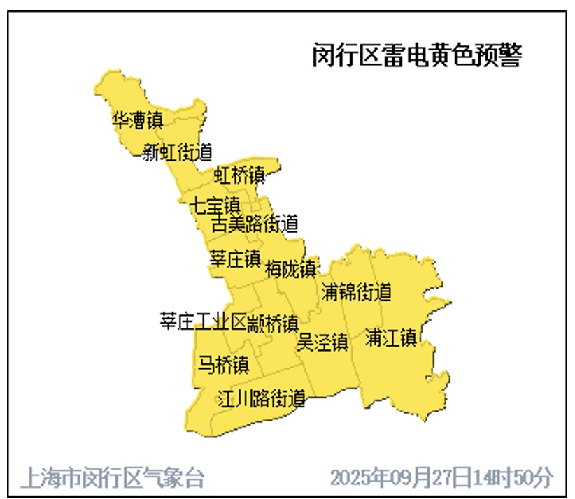 上海市闵行区气象台2025年9月27日14时50分发布雷电黄色预警信号: