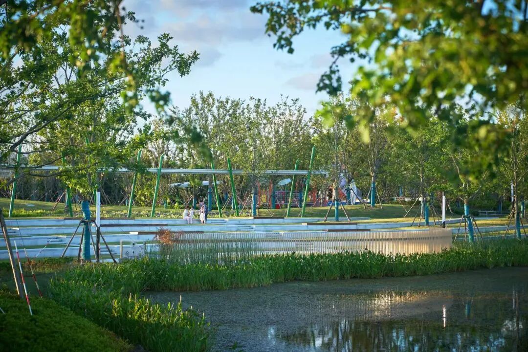 公园整体以通透的疏林草地为基调,新增了特色开花乔木及色叶乔木,如白玉兰、早樱、紫薇、杉树等。同时,沿水岸戏台精心打造了紫藤主题长廊,进一步丰富了公园景观及游园体验。