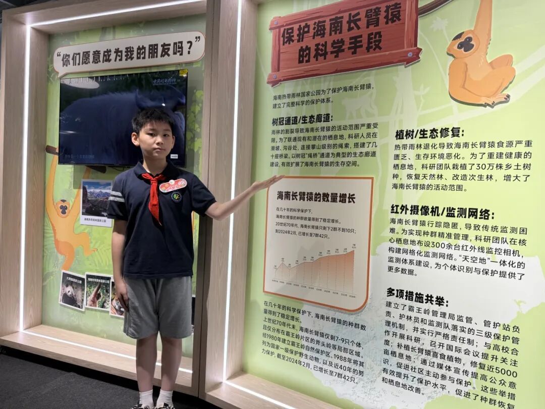 “我们经常会听到‘人与自然共生’这句话,海南热带雨林国家公园为了保护海南长臂猿,建立了完整科学的保护体系,在几十年的科学保护下,种群数量得到了稳定上升。”上海师范大学附属卢湾实验小学的五年级男生李骁衍向小编讲解着保护海南长臂猿的科学手段。