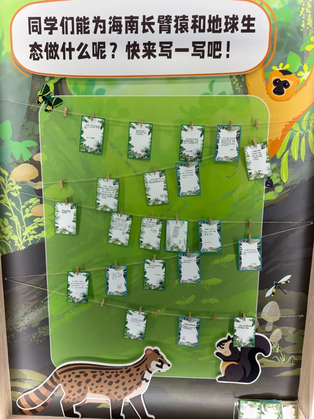 博物馆出口处,学生可以在相应区域写下能为海南长臂猿和地球生态所做的事,“用小报形式宣传海南长臂猿,让周围的人们一起保护它们。”“在野外遇见海南长臂猿,请不要伤害它们。”“我们可以减少车辆的碳排放,尽量绿色出行,为保护野生动物的生存环境出一份力。”