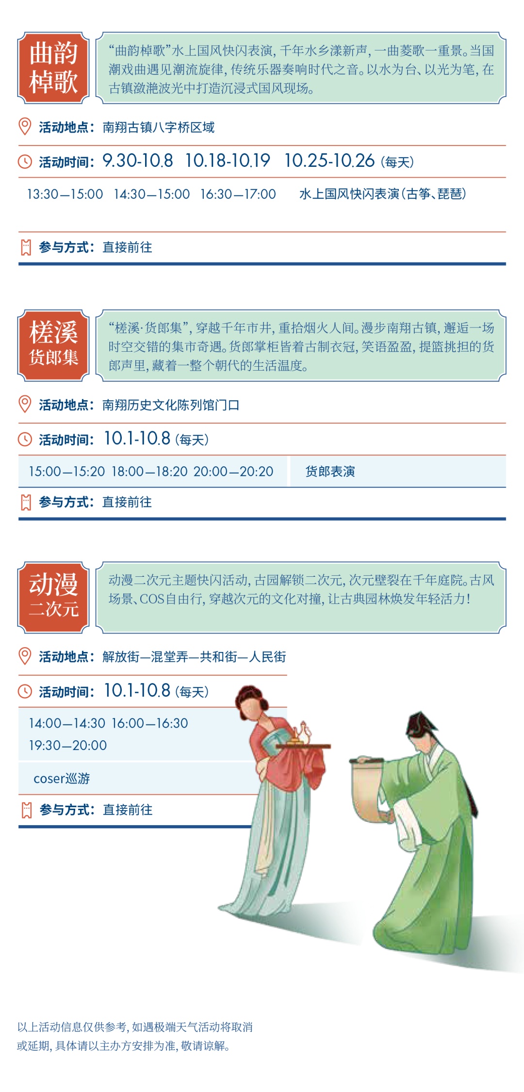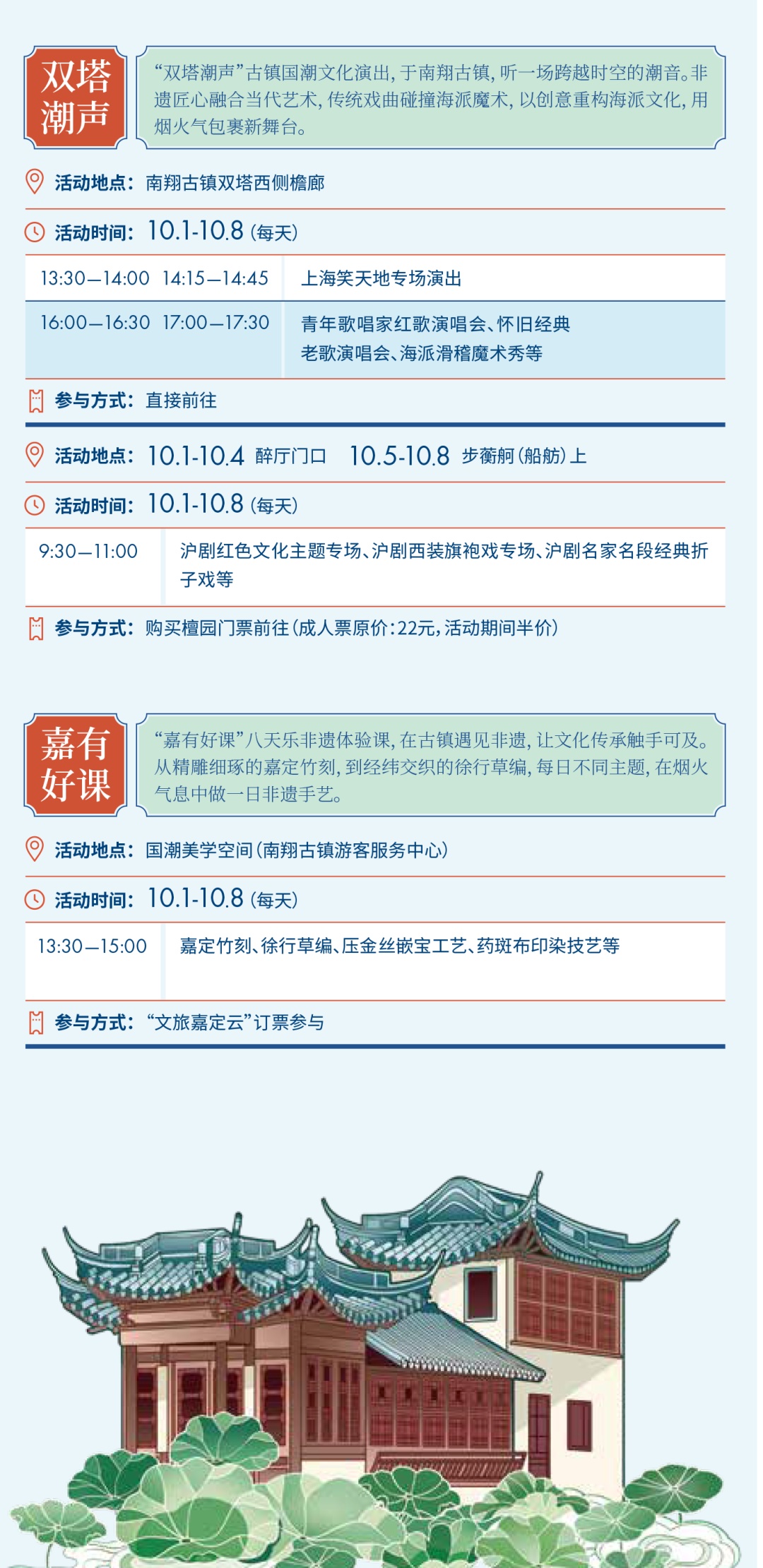 通过多元艺术形式的创新融合,为市民游客打造一个传统与现代交相辉映的文化盛宴,全方位展现海派文化与国潮文化的独特魅力。所有精彩演出与活动将以分时段、多场次的方式呈现。