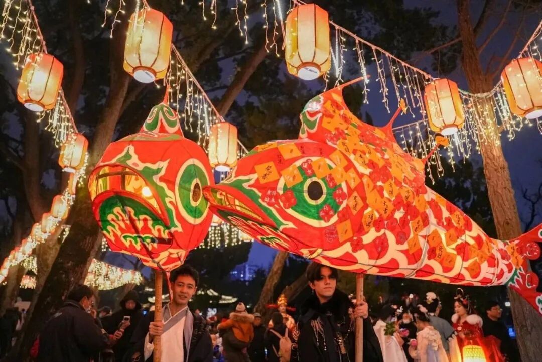 而中秋夜专属的“鱼生平安”非遗鱼灯巡游,将夜游氛围推向高潮,数盏巨型鱼灯在园林中缓缓穿梭,灯光与水景交相辉映,带来极具冲击力的视觉盛宴。