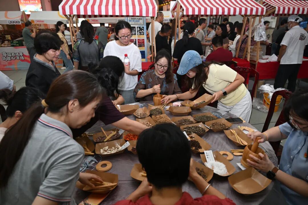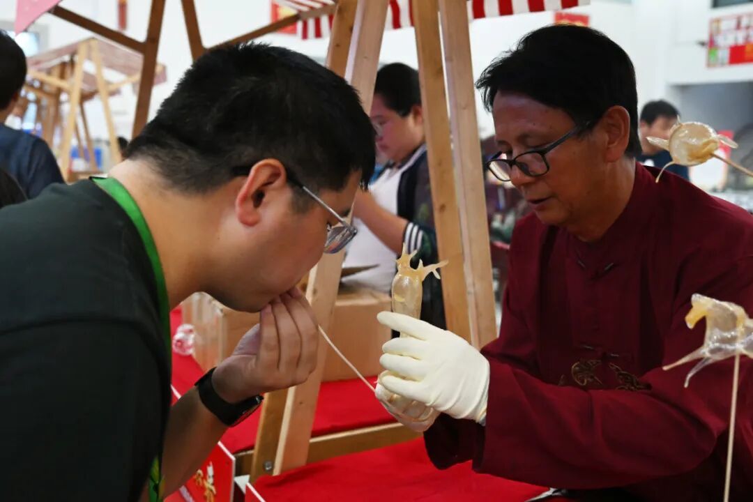 傍晚 5 点,活动还未正式开始,现场已热闹非凡。只听“啪” 的一声扣压声,一笼笼热气腾腾的徐行蒸糕新鲜出炉,糯米的香味瞬间吸引食客大排长队;隔壁吹糖人摊位前,老师傅手腕轻转,鼓腮慢吹,琥珀色的糖浆就化作灵动的小动物,引得围观职工阵阵喝彩;捏泥塑、烘焙、水果等 20 多个摊位前同样被围得满满当当。